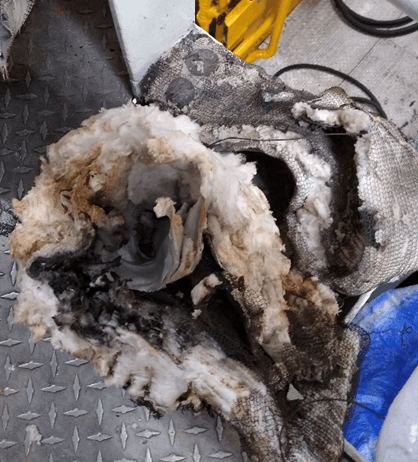 This pattern is common when insulation designed primarily for enclosed engine-room environments is installed in exposed areas of the vessel.